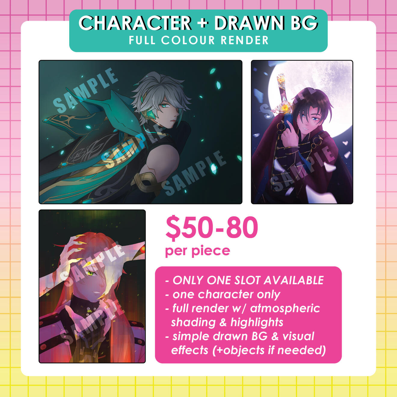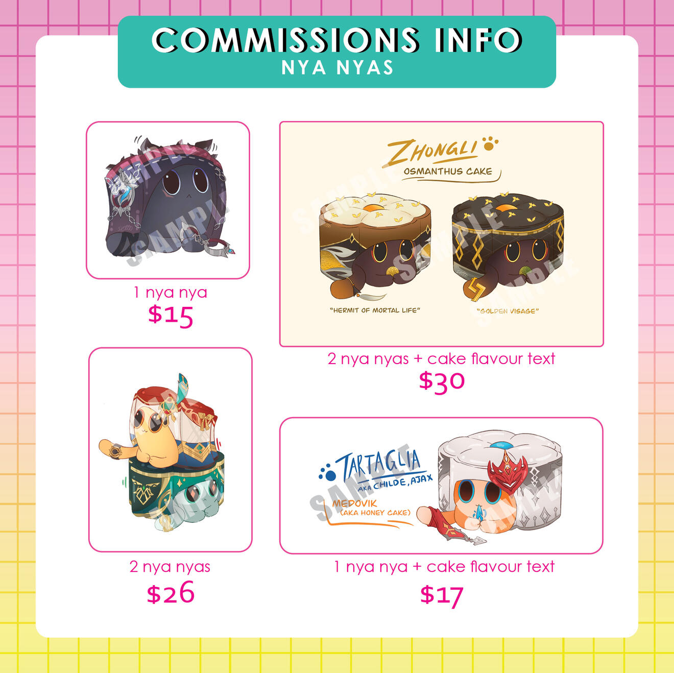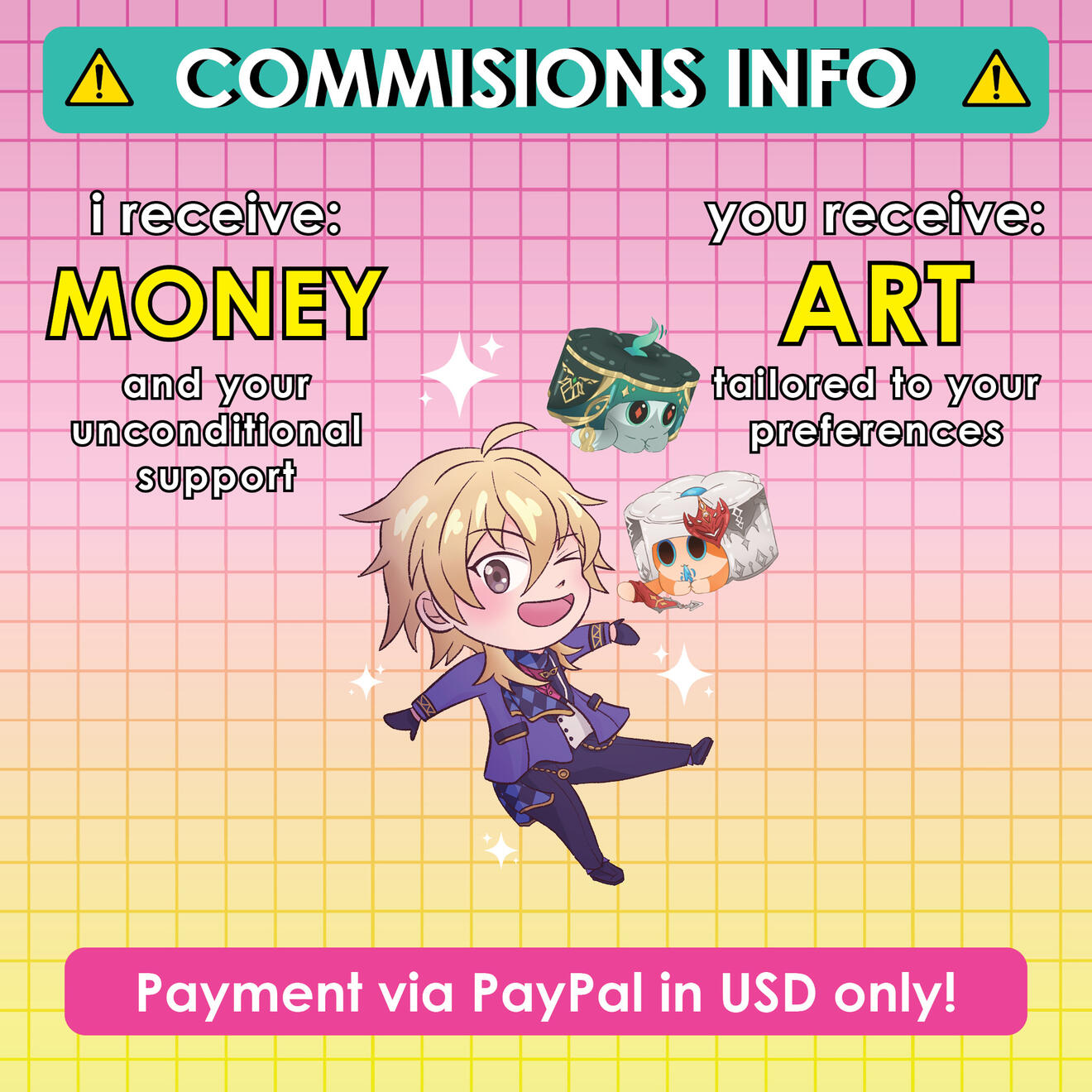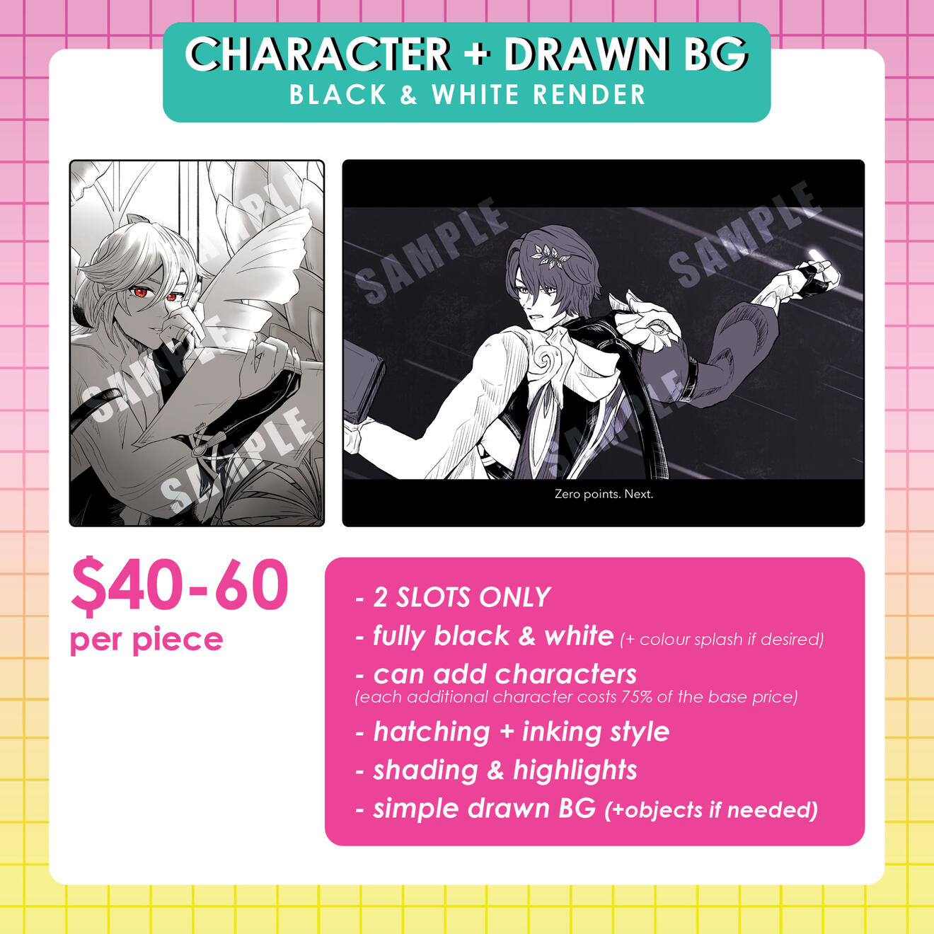 I can draw full characters, chibis and those custom-designed critters from HSR (to which I call them nya nyas cuz they're that cute)! I also offer full colour or B&W illustrations featuring different brush textures if preferred :3Note: I'll also be opening graphic design commissions in the future. So do stay tuned for that!